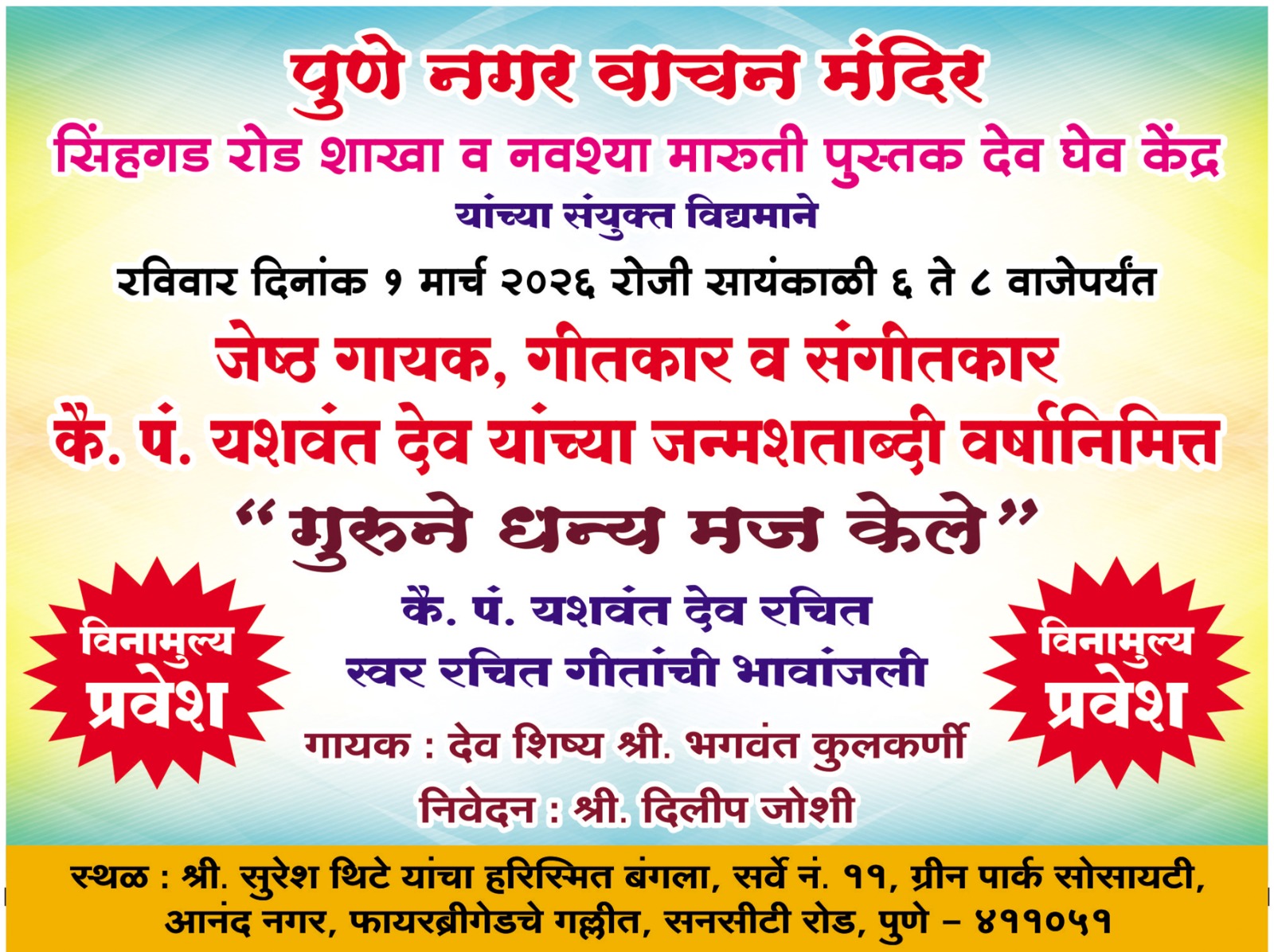 Address: Pandit Dindayal Upadhyay Sabhagruh, Tulip Sabhagruh, Near Navshya Maruti, Sinhgad Road, Pune 411251